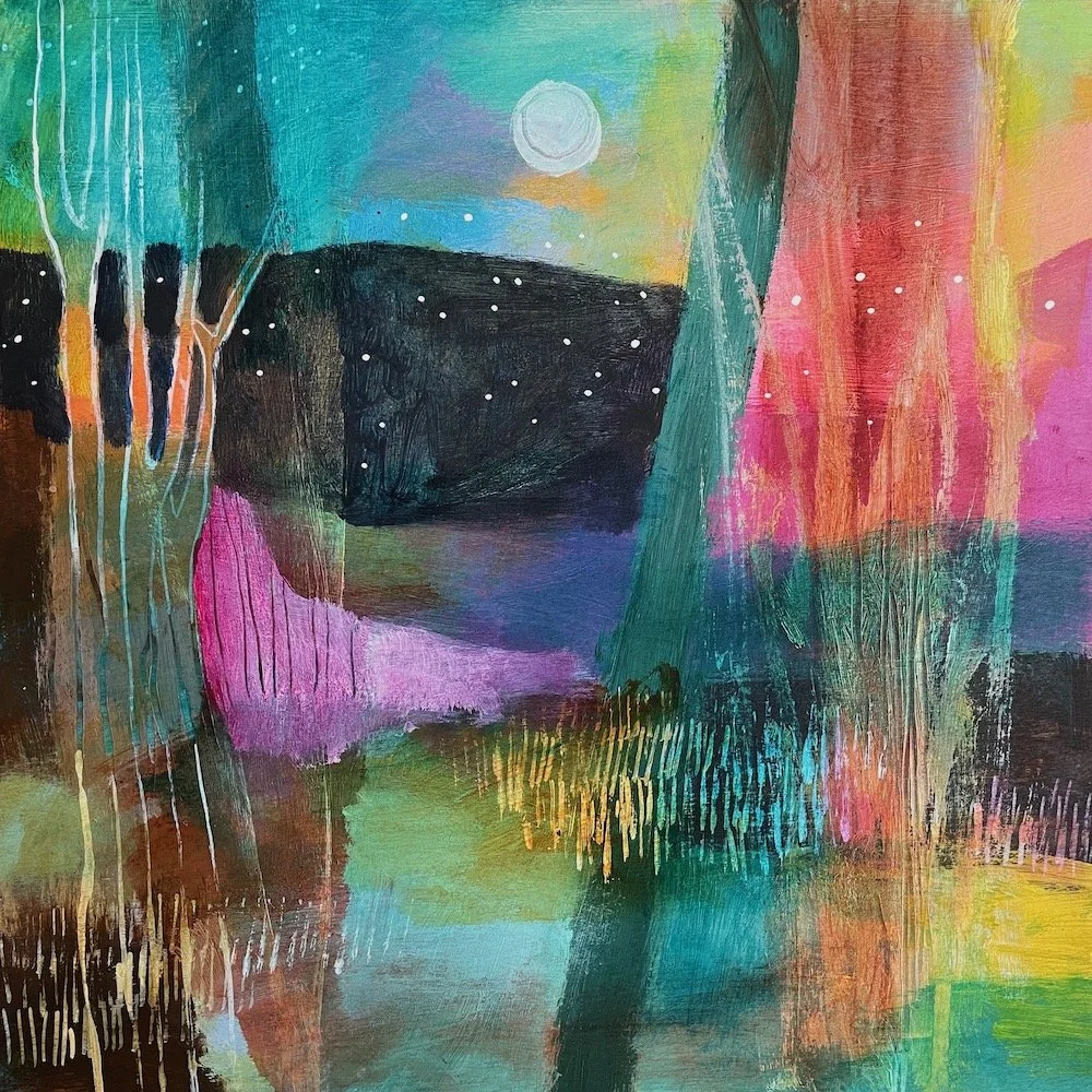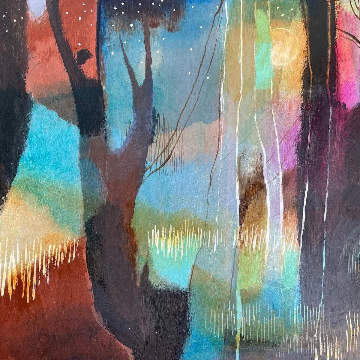 The moment that day becomes night is a recurring theme in my work. The sense of transitional space intrigues me and moves me to paint. The layers of golden light or indigo nights and earthy hues are suggestive of what I see in the dog park as the visual is filtered through my imagination.